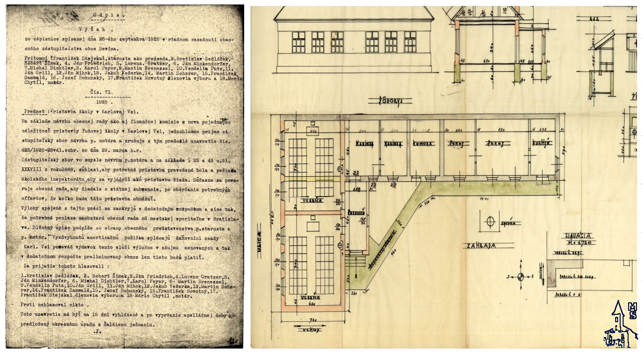 Kópia zápisnice z rokovania obecného zastupiteľstva obce Devín 26. 8. 1925. Schválilo prístavbu starej karloveskej školy, ako aj spôsob jej financovania. O splácaní potrebného úveru prijalo tento záver: “...Dlžobný úpis zo strany obecného predstaviteľstva podpíše p. starosta a p. notár. Vyzdvihnutú amortizačnú pôžičku splácajú daňovníci osady Karl. Ves, poneváč výdavok tento slúži zájmu menovaných...
