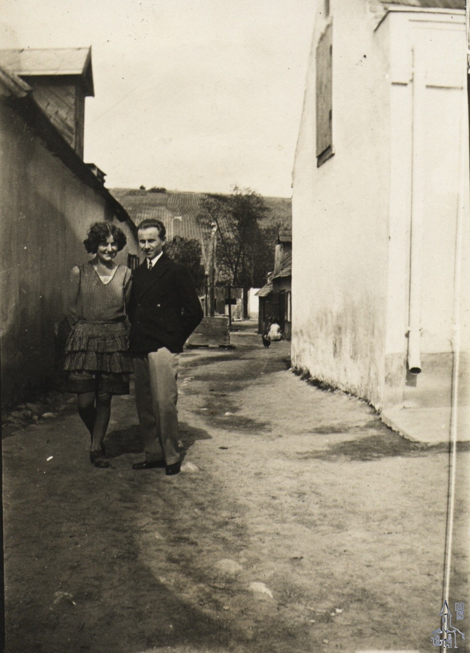 Jozefína Buzinkayová 1914 – 2005 so svojím manželom Antonom Kostolanským vo dvore rodičovského domu. Uprostred dvora je vahadlová studňa. Vpravo Šághyho mäsiarstvo.V pozadí je úbočie s vinohradmi v Líščom údolí nazývané Puclíky. Dnes už po nich nie je ani stopy.
